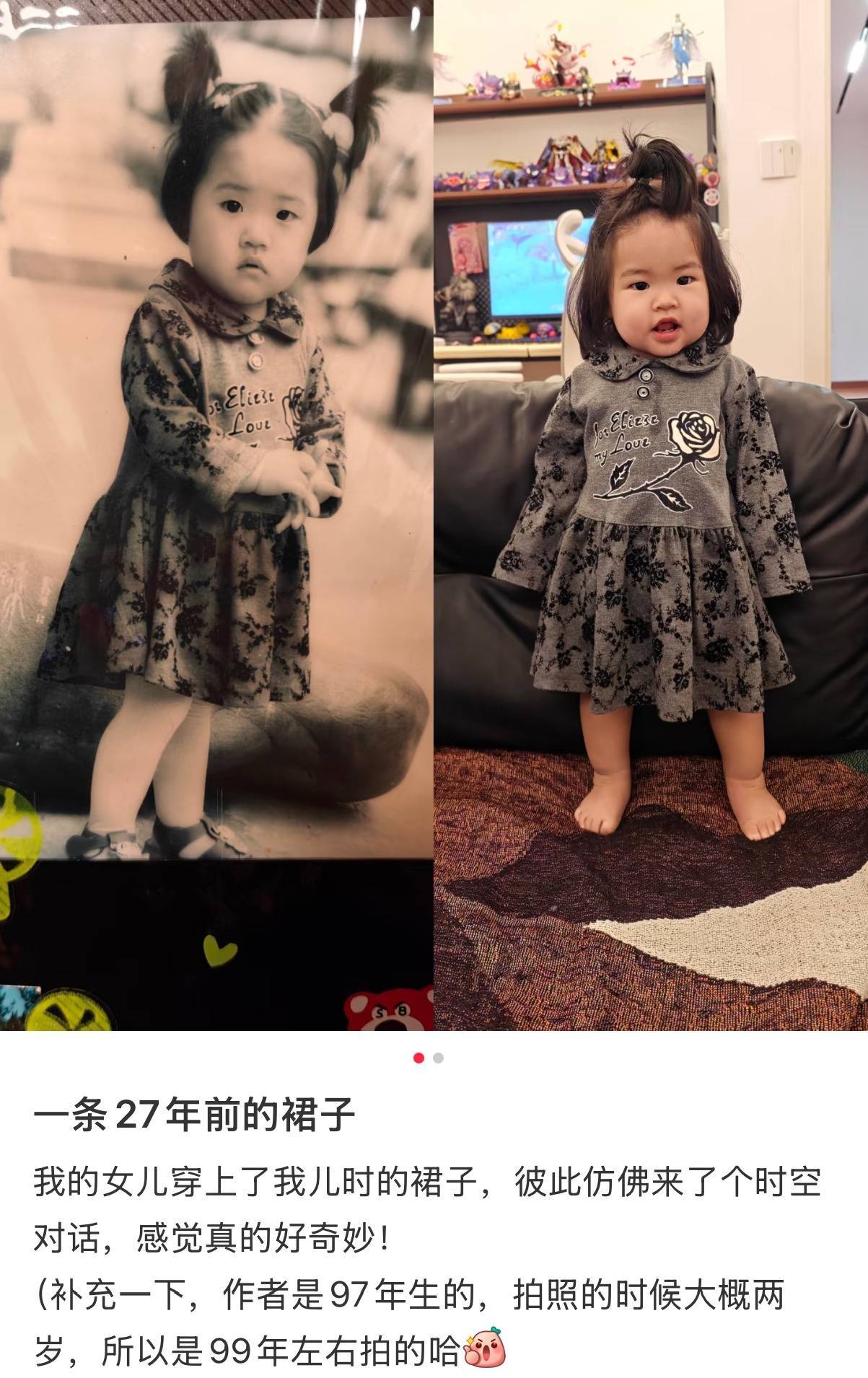 近日,贵州一位网友给女儿穿上自己一条27年前的裙子,把照片放在一起对比的时候称“仿佛来了个时空对话”。