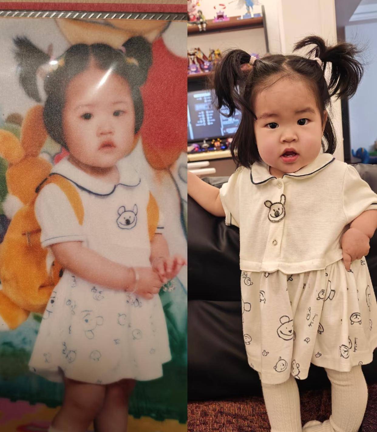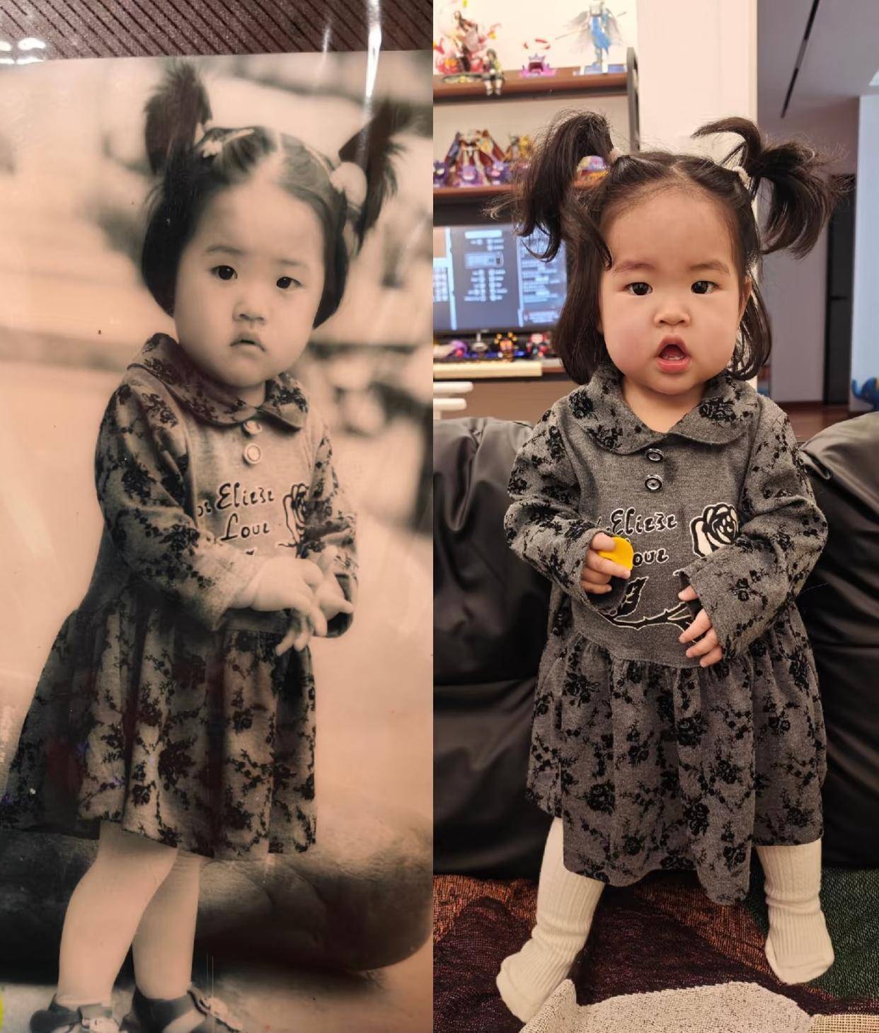 3月3日,潇湘晨报·晨视频记者联系到发布者田女士,田女士1997年出生,照片里这条款式素雅的连衣裙,是她一岁半时穿过的衣服。时光流转二十七年后,如今她的女儿也长到了一岁四个月,当年自己母亲细心珍藏的小裙子,再次被翻找出来。“我妈妈留了我小时候的衣服,到我的宝宝长大了就可以穿上的年纪,就突然拿给我了”。当小小的女儿穿上这条历经27年岁月的裙子,与妈妈儿时的照片并排放在一起时,两张稚嫩又相似的脸庞,几乎让人分不清,以为是同一个孩子。
