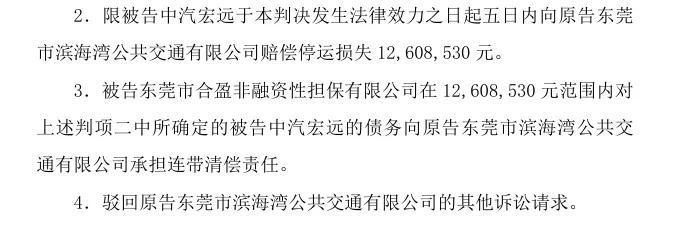 但在双方争议的核心——经济赔偿方面,判决结果与原告的预期相去甚远。判决书显示,中汽宏远需向东莞巴士赔偿停运损失1900.4万元,向东莞城巴赔偿3283.1万元,向滨海湾公交赔偿1260.85万元,三案合计判赔金额约为6444.35万元,仅占原告诉求总额5.5亿元的11.6%。